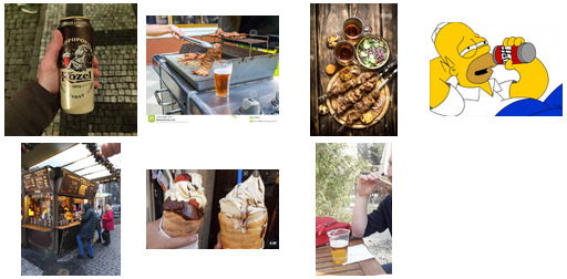 So, I have selected the can beer, the beer near the fire-pit for barbeque, Duff from The Simpsons, and top-down view of the beer glasses near the shashlyck for the Beer class. For the Trdelnik I selected close-up view with a toppings – not popular at that time yet – similar to the beer foam, and the kiosk selling the trdelnik. Finally, to make people less sad, I have found the image, which contains both, so any answer would be correct. Here is my test set in full: